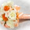 Свадебное торжество будет не полным без очаровательного и эксклюзивного букета невеста. Сочетание белых и кремовых роз в светло-оранжевой ленте подойдет для девушки, цвет платья у которой такого же оттенка. Букет прекрасно будет сочетаться с нарядом, что позволит невесте блистать на свадебных фотографиях.